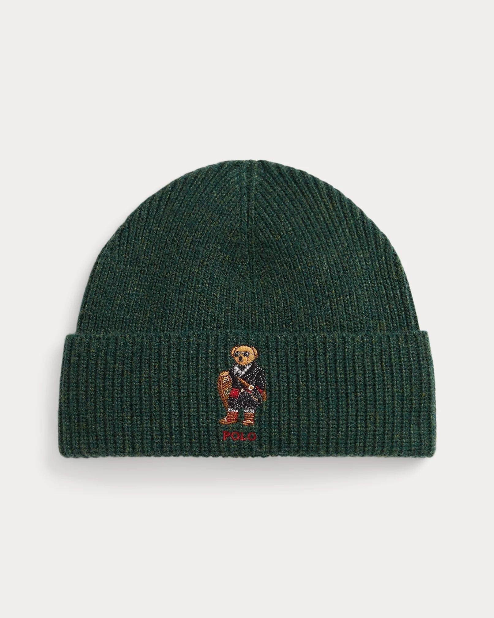 The iconic Polo Bear, dressed in a stylish outfit holding vintage-style snowshoes, is embroidered on this soft rib-knit beanie.